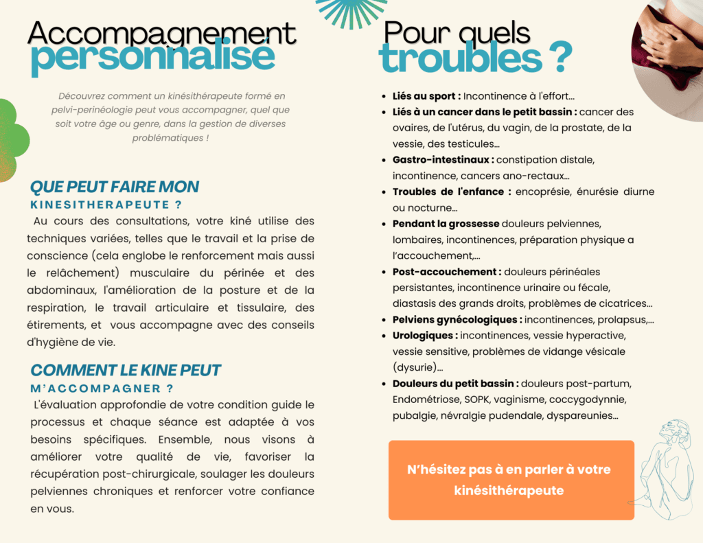 Le kinésithérapeute en pelvi-périnéologie a des compétences et des techniques variées et propose de nombreux conseils en hygiène de vie.
